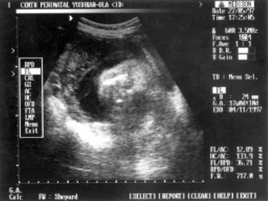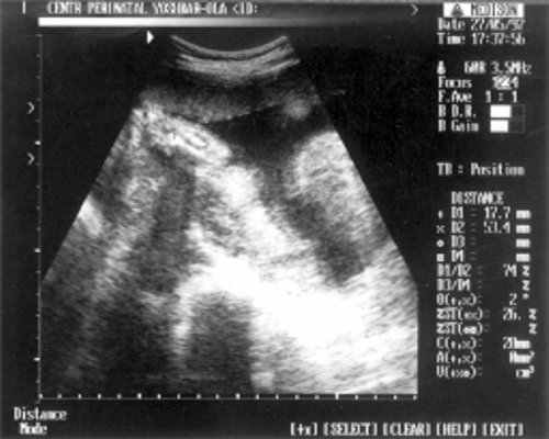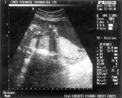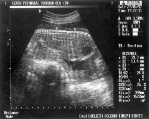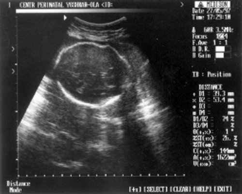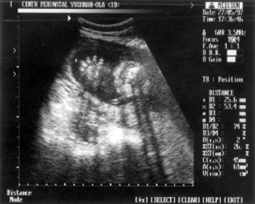 Беременная П., направлена на ультразвуковое исследование плода на сроке 24 нед. беременности. Настоящая беременность - 2-я; 1-я закончилась медицинским абортом на сроке 9 нед. без осложнений. Соматический и наследственный анамнезы не отягощены. Эхографическое исследование плода проводилось с помощью ультразвукового сканера "SonoRex" , оснащенного трансабдоминальным датчиком 3,5 МГц.