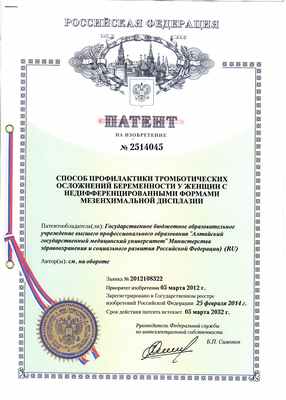 Изобретение "СПОСОБ ПРОФИЛАКТИКИ ТРОМБОТИЧЕСКИХ ОСЛОЖНЕНИЙ БЕРЕМЕННОСТИ У ЖЕНЩИН С НЕДИФФЕРЕНЦИРОВАННЫМИ ФОРМАМИ МЕЗЕНХИМАЛЬНОЙ ДИСПЛАЗИИ" (Кудинова Е.Г., Момот А.П., Уварова Е.В.) отмечено юбилейной наградой (25 лет Российской Академии Естествознания)