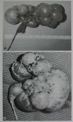 Н.А. Лопаткин и А.В. Люлько [9] выделяют два варианта мультикистозных почек у взрослых: 1) большой конгломерат кист различного размера массой до 100-250 г; 2) комок соединительной ткани с одной небольшой или несколькими мелкими кистами массой более 10-20 г.