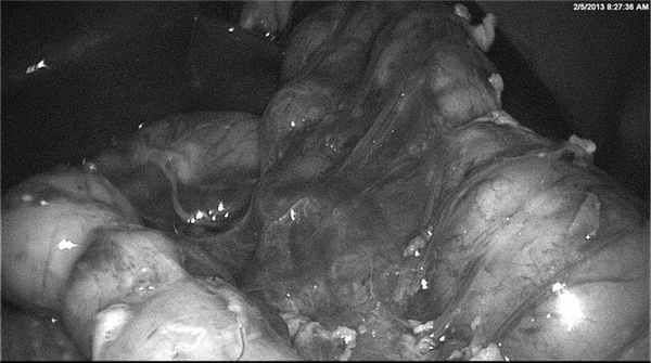Интраоперационная фотография. Вид органов брюшной полости после выполнения операции Ледда. Слева находится выпрямленная двенадцатиперстная кишка, справа - толстая кишка, перемещенная в левую половину брюшной полости.
