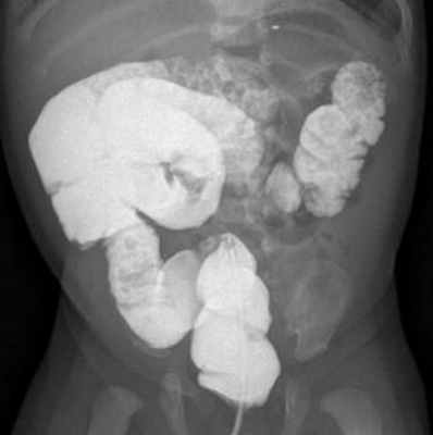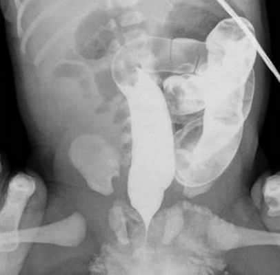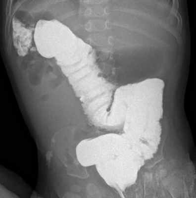 Рентгенологические исследования также проводят после помещения бария в прямую кишку младенца (так называемая бариевая клизма Рентгенологические исследования пищеварительного тракта с использованием бария Рентгенологические исследования часто используются для оценки нарушений пищеварения. Стандартные рентгенологические исследования (обычные рентгенологические исследования) не требуют никакой. Прочитайте дополнительные сведения ) или проглатывания его младенцем (рентгенография верхних отделов желудочно-кишечного тракта [ЖКТ]). На рентгенограммах барий выглядит белым и очерчивает пищеварительный тракт, показывая контуры и слизистую пищевода, желудка, тонкой кишки и толстой кишки. Рентгенологические исследования с использованием бария могут помочь врачам увидеть, находятся ли нижние отделы кишечника в аномальном положении.
