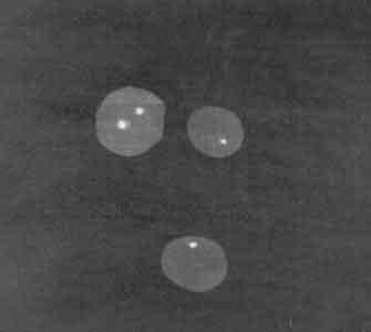 Во втором наблюдении исследовано 400 лимфоцитов, так как было обнаружено 3 типа клеток, различающихся между собой по количеству сигналов в ядрах, принадлежащих зонду хромосомы Х. 70% ядер имели один флюоресцентный сигнал, 30% - два одинаковых сигнала и только 2 клетки из 400 имели 3 сигнала, указывающих на наличие хромосомы Х (рис. 4). Учитывая факт присутствия в крови больной 3 типов клеток с разным количеством Х-сигналов, можно было предположить о наличии сложного мозаицизма. Однако слишком маленький процент клеток с 3 сигналами не исключал присутствия артефакта. Анализ результата исследования лимфоцитов пациентки методом FISH показал, что маркерная хромосома являлась дериватом хромосомы Х. Учитывая небольшие размеры этой хромосомы, установить точно места (границы, точки) делеции не удалось. Полученные данные свидетельствовали, что кариотип больной имел формулу 45,Х/46,Х micro (Х).