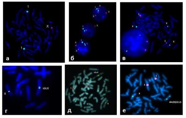 Рис. 1. Результаты FISH исследования с центромерным ДНК зондом на хромосому Х. (для контроля плоидности при интерфазном анализе применялся ДНК зонд на хромосому 1): а) метафазная пластина – 45,Х; б) интерфазные ядра с тремя, одной и двумя хромосомами Х (сверху вниз) у одного пациента; в) метафазная пластина – 47,ХХХ; г) нормальная и изодицентрическая хромосома Х – idic(X)(p11.2) (табл.2, №9); д) позднореплицирующаяся изодицентрическая хромосома Х, специфическая окраска после культивирования с BrDU указывает на инактивацию перестроенной хромосомы (табл.2, №8); е) нормальная и изодицентрическая хромосома Х с точкой разрыва Хq22.2. (табл.2, №10)