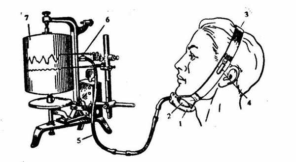 к подбородку больше чем на 1/3 его объема. Давление воздуха в системе должно быть одинаковым с давлением окружающего воздуха. Перед каждой записью для уравнивания давления резиновую трубку отсоединяют от баллона и тут же вновь герметизируют систему. Степень прижима определяют по градуированной шкале.