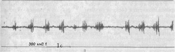 При произвольном жевании ядра ореха ЭМГ представляет собой четкое синхронное чередование фаз БЭА и БЭП (рис. 63). Фазы БЭА жевательных мышц возникают в ритме жевательных движений и соответствуют им. БЭА характеризуется нарастанием частоты и амплитуды биопотенциалов, которые в середине фазы достигают максимальных значений, после чего происходят снижение их величины и переход в фазу БЭП, выраженную на ЭМГ в виде прямой линии на уровне изоэлектрической.