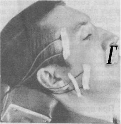 Как говорилось выше, фиксация к подбородку пластмассового футляра с резиновым баллоном производится при помощи повязки с градуированной шкалой или проволочного круга с боковыми повязками. Для обеспечения в