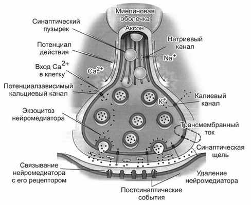 Мембрану пресинаптической терминали называют пресинаптической мембраной. Она содержит большое количество электроуправляемых кальциевых каналов. Когда потенциал действия деполяризует пресинаптическую мембрану, эти кальциевые каналы открываются, что позволяет большому числу ионов кальция войти в терминалы Количество медиатора, которое затем выделится из терминали в синаптическую щель, находится в прямой зависимости от числа вошедших ионов кальция.
