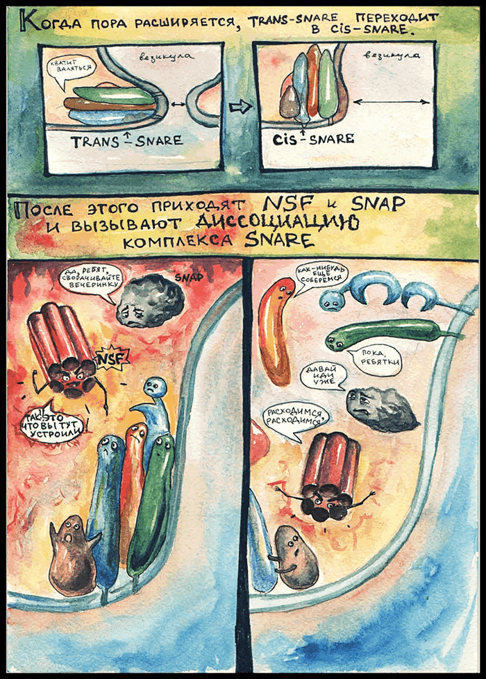 Но что же происходит с SNARE/SM комплексом потом? Когда пора расширяется, белки меняют расположение, поворачиваясь как бы перпендикулярно плоскости мембраны. А вскоре NSF — такая АТФаза — приходит из цитоплазмы вместе со своим кофактором SNAP, и они вызывают распад SNARE/SM комплекса. После этого везикула может отделиться от пресинаптической мембраны, но тут может происходить по-разному: