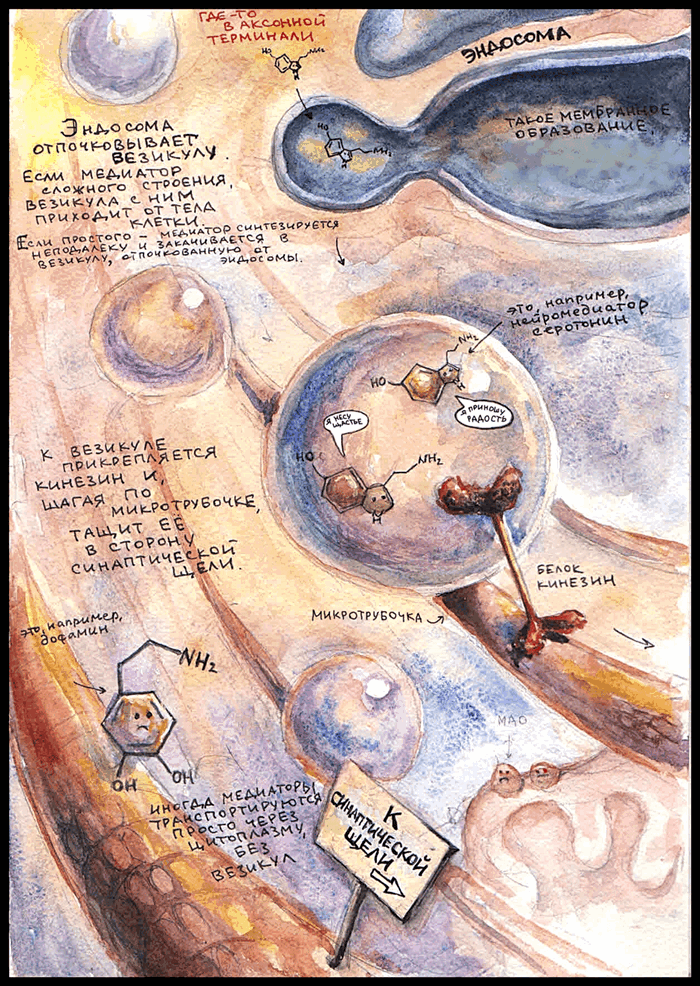 Маленькие и просто устроенные нейромедиаторы — например, ацетилхолин [4] — образуются из молекул-предшественников прямо в цитоплазме аксонной терминали. Там же они упаковываются в везикулы — мембранные пузырьки, которые могут отделяться от эндосомы или приходить от синаптической щели после высвобождения своего прошлого содержимого.