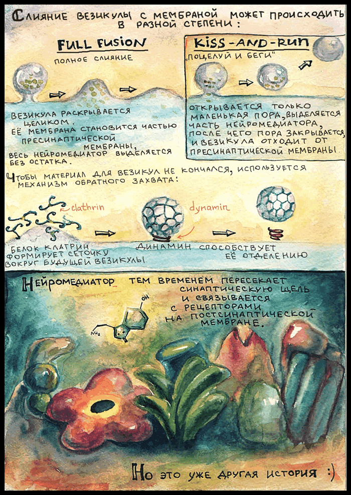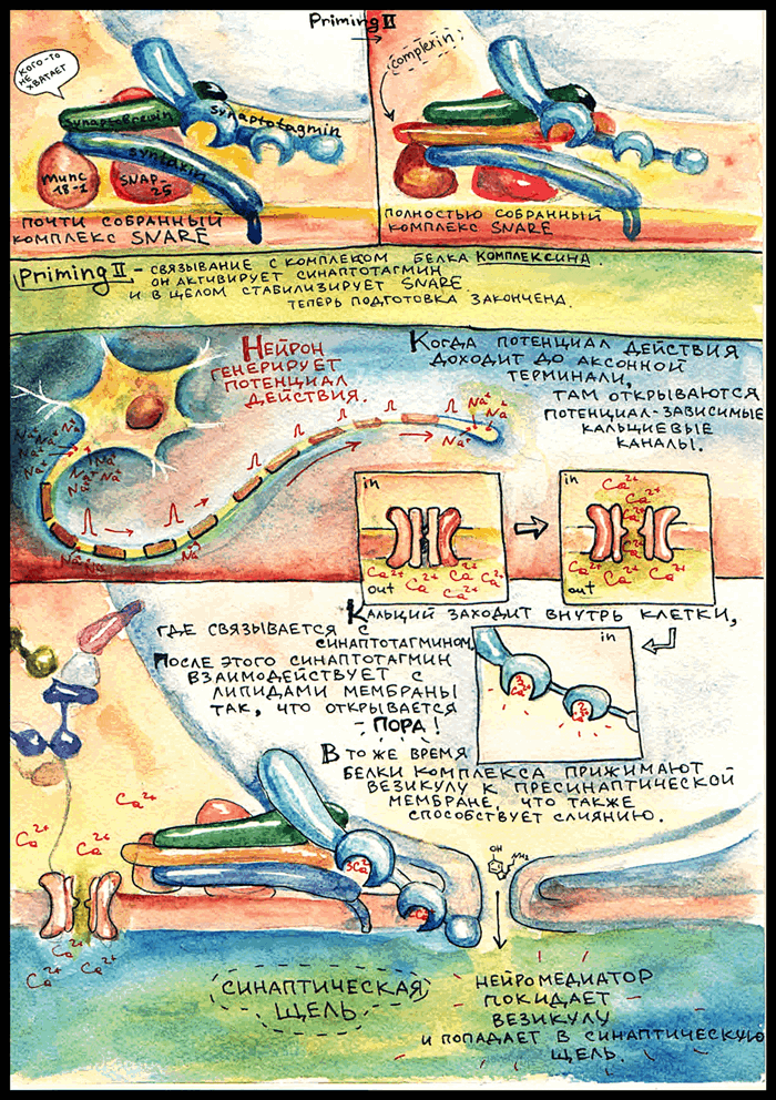 Комикс на конкурс «био/мол/текст»: Что происходит с момента синтеза нейромедиатора до связывания его с рецепторами на постсинаптической мембране? Комикс по мотивам Нобелевской лекции Томаса Зюдофа: молекулярный механизм выделения нейромедиатора в картинках. Конечно, это лишь малый фрагмент полной картины распространения импульсов в нервной системе, но зато посмотрите, как он красив!
