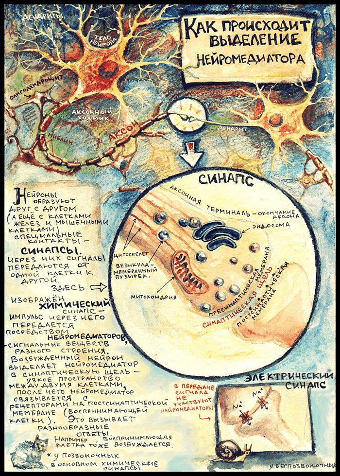 Синапсы — области контакта между нейронами — бывают химическими и электрическими. Химический синапс представляет собой непрямой контакт двух клеток: между их мембранами остается узкое пространство — синаптическая щель. Эффекторная клетка (та, от которой идет импульс), возбуждаясь, выделяет в синаптическую щель молекулы нейромедиатора , которые связываются с рецепторами на мембране воспринимающей клетки и вызывают ее ответ.