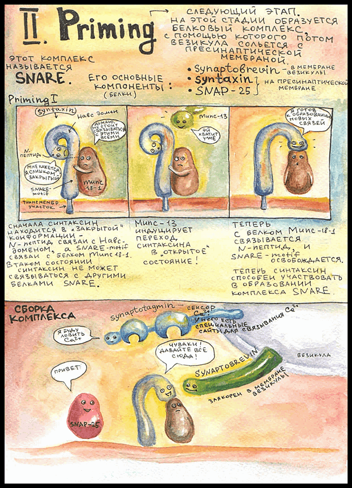 Следующий этап — это прайминг (priming; подготовка везикулы к слиянию). Подготовка заключается в образовании плотного белкового комплекса между мембраной везикулы и пресинаптической мембраной, в результате чего мембранный пузырек крепко прижимается к мембране аксона и становится способным реагировать на увеличение концентрации кальция.