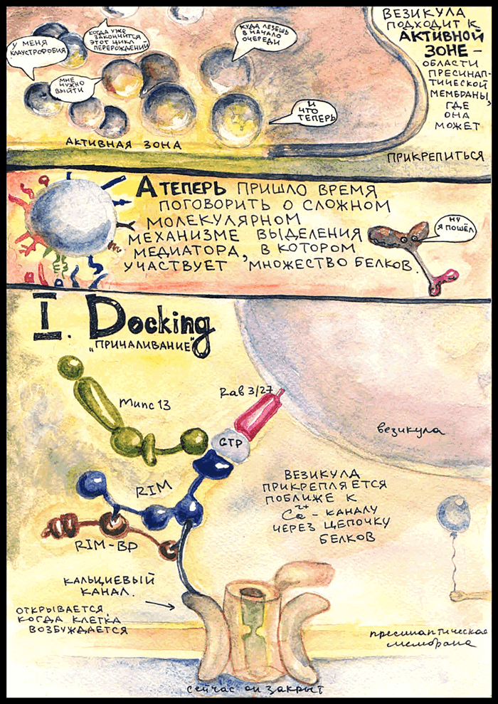 И вот, чтобы везикула могла как можно более оперативно выбросить медиатор, когда придет ПД, она прикрепляется к кальциевому каналу такой белковой «веревочкой». Формирование этой «веревочки» и называется докингом. Везикула «причаливает» к пресинаптической мембране, бросая «якорь» около кальциевого канала.