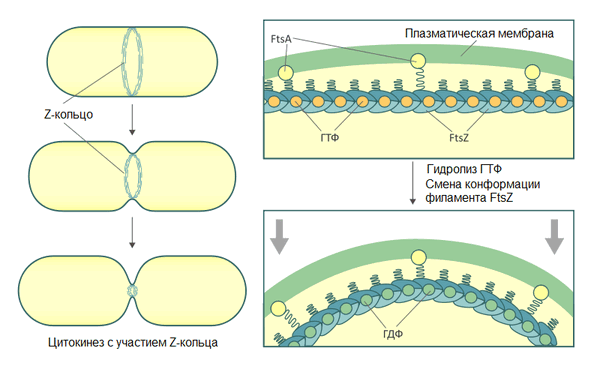 Белок FtsZ — прокариотический гомолог тубулина с похожей третичной структурой. Это позволяет предполагать, что ассоциация FtsZ в Z-кольцо может напоминать сборку микротрубочек эукариот. FtsZ, как и тубулин, обладает ГТФазной активностью, гидролиз ГТФ обеспечивает полимеризацию FtsZ с образованием линейных протофиламентов. Z-кольцо — динамичная структура: молекулы FtsZ в составе кольца постоянно заменяются молекулами из цитоплазматического пула.