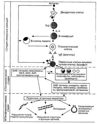 Иммунологическая стадия. Первая встреча с аллергеном не приводит к проявлению каких-либо признаков повышенной чувствительности. Антиген взаимодействует с антигенпредставляющими клетками (макрофагами, В-лимфоцитами, дендритными клетками и т.д.). Далее антиген переносится внутрь клетки. После внутриклеточной переработки (процессинга) антиген выносится на клеточную поверхность и встраивается в комплексе с молекулами HLA-II. Этот процесс называется презентацией. Далее происходит дифференцировка общего предшественника Th0 в Th2 под действием IL-4 и IL-13, выделяемыми активированными клетками. Измененный комплекс HLA-II распознается Th2, которые обеспечивают сигнал для пролиферации и дифференцировки В-лимфоцитов. Th2 секретируют интерлейкин-4, который переключает внутриклеточный синтез иммуноглобулинов В-лимфоцитами на продукцию IgЕ. Одновременно на Тh2 экспрессируется лиганд CD40L, с которым связывается молекула CD40L на мембране В-лимфоцита. Это связывание обеспечивает второй сигнал для переключения на синтез IgЕ. Синтез IgЕ усиливается под действием IL-5, IL-6, IL-10, IL-13, продуцируемыми Тh2.