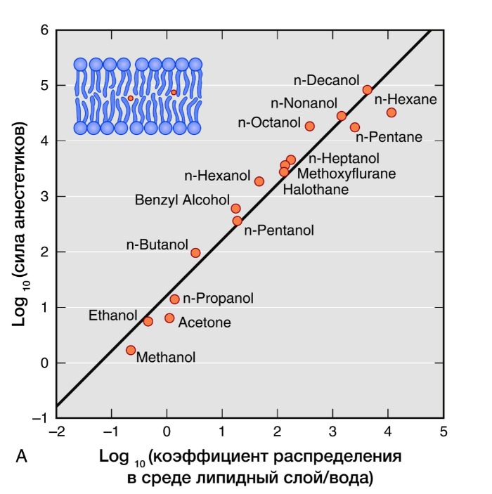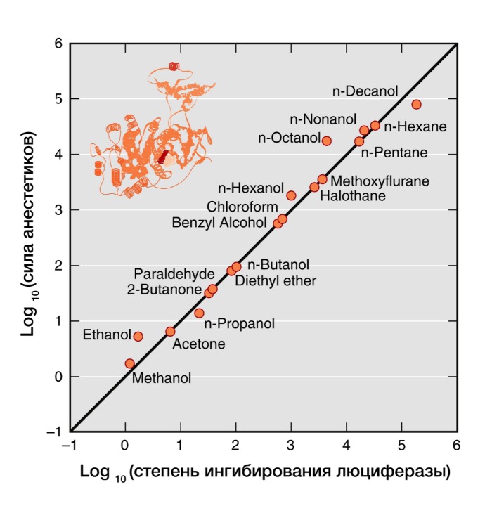 Рисунок 4 | В 20 веке было показано, что сила общих анестетиков коррелируют с их способностью ингибировать активность растворимого фермента люциферазы, который физиологически не является мишенью анестетиков, но служит в качестве безлипидной модели белковой молекулы для связывания анестетика.