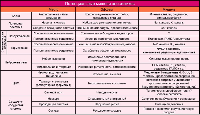 Несмотря на возрастающее число иследований в области анестезиологии, наши знания о механизмах наркоза остаются не достаточными. Возможно, что наркотические вещества на молекулярном уровне имеют несколько точек первичного воздействия, что обусловливает многогранности механизмов наркоза.