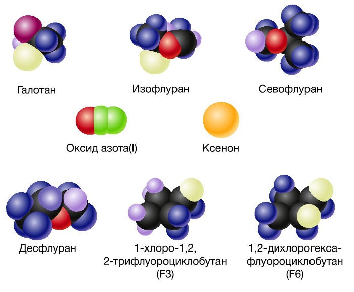 — вводимые внутривенно анестетики для вводного наркоза и ингаляционные анестетики для поддержания анестезии;
