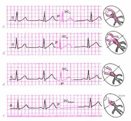 При ЭС из верхних отделовпредсердий зубец Р' мало отличается от нормы. При ЭС из средних отделов -зубец Р' деформирован, а при ЭС из нижних от делов - отрицательный (рис. 19, а, б, в).