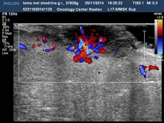 Данные доплеровские признаки, с нашей точки зрения, могут быть использованы в качестве надежных диагностических критериев узловой меланомы кожи. Следует отметить, что при узловых меланомах всегда идентифицировалась патологическая ангиоархитектоника в прилежащих латеральных зонах кожи. Выявления особенностей гемодинамики узловых меланом имеет особое значение в планировании характера и объема операции в онкодерматологии [8,10].