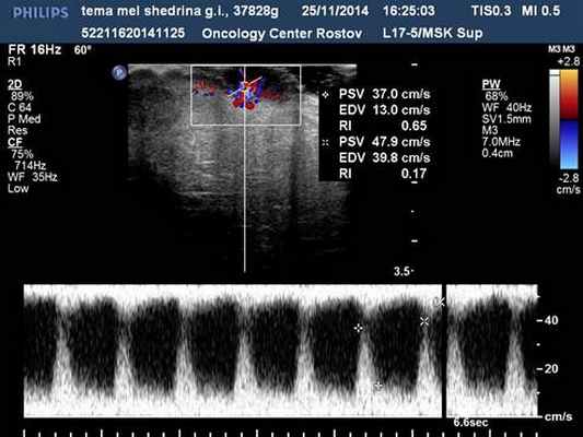 Рис. 2. Узловая меланома кожи. Допплерометрия в сосудах опухоли. Патологические артерио-артериальные анастамозы с параметрами пиковых систолических скоростей 37,0-47,9см/с (ИР 0,17–0,65)