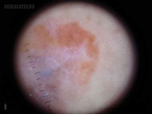 На ранних стадиях лентигинозная меланома выглядит как пигментное пятно или веснушка, не выделяясь на коже. Ее цвет может быть разным: от белого, розового, желтоватого до коричневого, чаще он неоднородный. Интенсивность окраски увеличивается по мере роста опухоли. Края пятна неровные, четкие, поверхность гладкая, не возвышается над кожей.