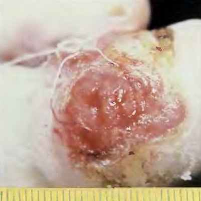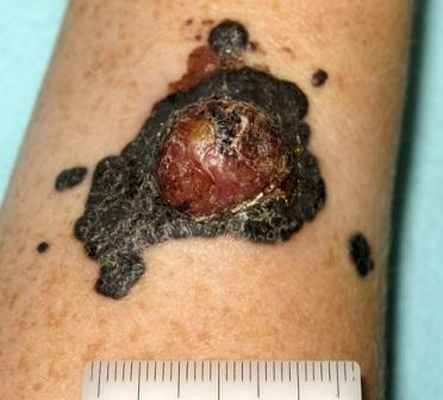 Самое опасное, что рост ахроматической меланомы отмечается не только вверх, но и вглубь кожи. Оно склонно к распаду. Поэтому на поздних стадиях опухоль выглядит как язва, края которой плотные и приподнятые, а на дне видны мелкие сосочки.