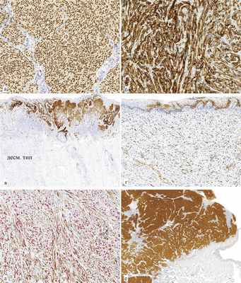 Интересной особенностью, отмеченной и в предыдущих работах, явилась диффузная иммуноэкспрессия SMA в меланомах десмопластического типа [13]. При этом двойное окрашивание с S100 показало, что гладкомышечный актин экспрессируется на S100-негативных миофибробластоподобных клетках, расположенных диффузно между S100-позитивными меланоцитарными, в свою очередь негативных к SMA (см. рис. 2, д). Мы обнаружили только одну работу, содержащую результаты аналогичного исследования [14]. Количество актин-позитивных клеток было взаимосвязано со степенью межклеточной коллагенизации и уменьшалось в более клеточных участках смешанных десмопластических и саркоматоидных разновидностей, где носило межпучковый характер. Эти клетки отсутствовали в веретеноклеточных нодулярных и поверхностно распространяющихся меланомах, а также в соответствующей части комбинированных форм.