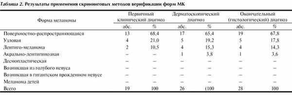 При дерматоскопическом исследовании диагностировано по одному случаю акрально-лентигинозной и персистирующей меланомы (рецидив ПРЗМ). По результатам гистологического исследования выявлено 28 случаев МК. Из них в 67,8% ПРЗМ, в 17,8% — узловая, в 14,3% — лентиго-меланома и в 3,6% — акрально-лентигинозная. Результаты скрининговых методов верификации представлены в табл. 2.