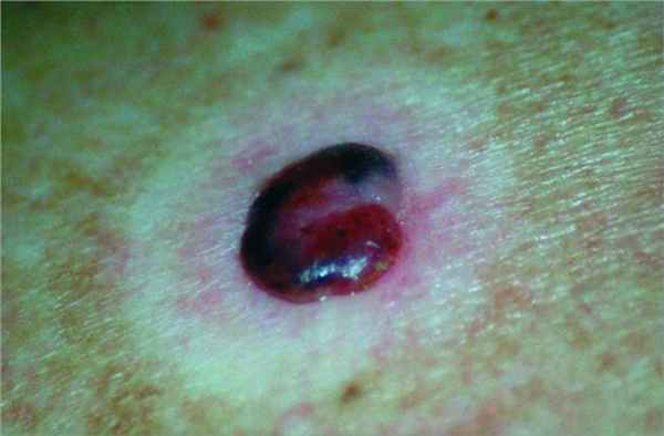 Элементы сыпи голубой меланомы. В настоящее время определено, что имеются две формы опухоли. Чаще всего злокачественный голубой невус развивается на фоне длительно (до нескольких лет) существующего клеточного голубого невуса. Но может быть другая более редкая форма: меланома, возникающая de novo и сразу имеющая морфологические признаки, напоминающие клеточный голубой невус. Размеры опухоли, как правило, более 2 см в диаметре, в 26% случаев отмечается изъязвление новообразования.