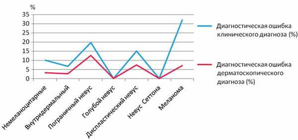Риск диагностической ошибки при постановке первичного клинического диагноза очень высок (32,1%), но значительно снижается (до 7,1%) при использовании дерматоскопического исследования, в результате чего постановка правильного диагноза повышается на 25%.