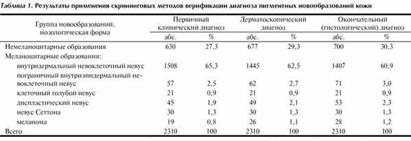 Результаты верификации диагнозов пигментных новообразований кожи представлены в табл 1.