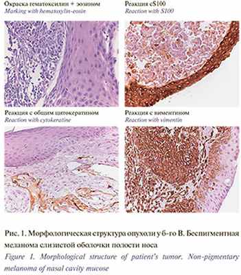 Полость носа — самая частая локализация меланомы слизистых оболочек (СО) головы и шеи. При меланоме СО пигментированные формы встречаются реже, чем при меланоме кожи. Выделяют два клинических варианта: узловую и многоочаговую меланому СО. Клетки этого злокачественного новообразования характеризуются меньшей силой сцепления, чем при раке. При меланоме in situ необходимо провести дифференциальную диагностику между первичном поражении СО и метастатической опухолью. Ключевым диагностическим признаком меланомы считают наличие выраженных ядрышек в ядрах клеток [1].