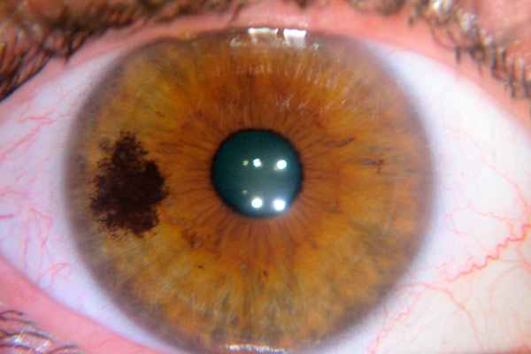 - появление пигментации в радужной зоне глаза – окрашивание тканей в более темные тона, явление, свойственное меланоме, независимо от того, в каком именно отделе тела человека она развивается;