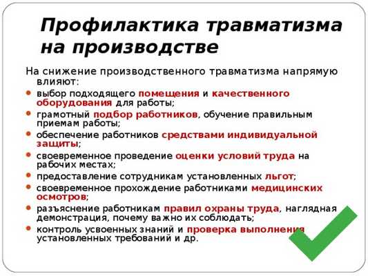 В соответствии с основными категориями причин получения травм на производстве в конкретной организации устанавливается список действий, которые способны обеспечить действенную профилактику производственного травматизма в компании.