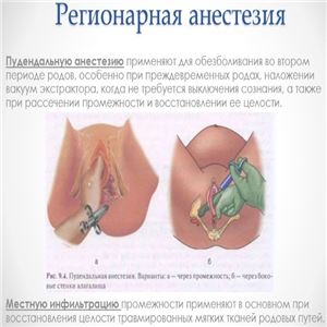Этот вид анестезии используется для обезболивания родов. При пудендальной анестезии блокируется половой нерв. Раствор анестетика вводится в седалищно-прямокишечную область. В ней происходит разветвление нерва. Преимущества этого вида анестезии в том, что она не отключает сознание, не расслабляет мышцы, и роженица может самостоятельно тужиться.