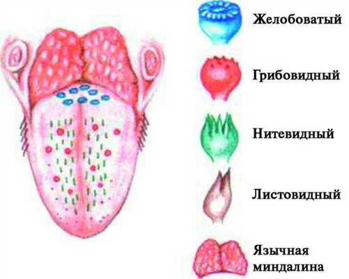 Грибовидные сосочки расположены на кончике языка, листовидные – по бокам, желобовидные - на корне [1, 3, 9]. Последние окружены валиком, в который открывается секрет мелких белковых желез. Это необходимо, во-первых, для удаления частиц пищи с поверхности сосочка, а во-вторых, при этом растворенное вещество лучше воспринимается рецептором. Именно поэтому при плохой гигиене языка снижается его вкусовая чувствительность.