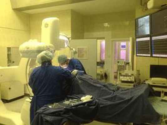 РЧА сердца проводится в условиях местной либо комбинированной (местной и внутривенной) анестезии в рентгеноперационной, оснащенной специальным электрофизиологическим и реанимационным медоборудованием (рисунок 1). Рентгеноперационная нашего отделения оснащена системой магнитной навигации CARTO 3, позволяющей с высокой точностью (до 1 мм) локализовать очаг аритмии и устранить его с помощью катетерной аблации.