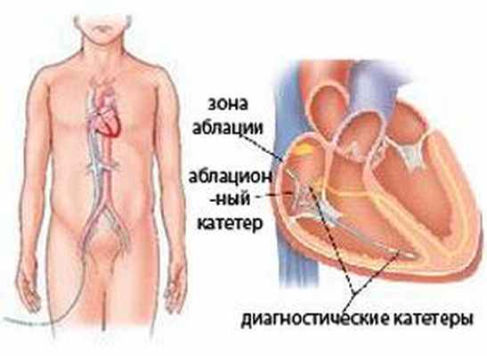 Затем тем же способом в сердце проводится «лечебный» катетер, на кончик которого подаётся высокочастотный ток для точечного воздействия на очаг аритмии.