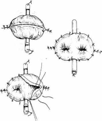- Формирование стомы необходимо осуществлять «закрытым» способом, вначале сшивая серозно-мышечный слой и кожу, а затем отсекать цилиндр слизистой оболочки.