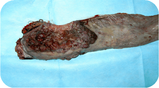 У больного Ш., 33 года, с 14 лет установлен диагноз - неспецифический язвенный колит. Многократно лечился в колопроктологическом отделении с НЯК, тотальным поражением, тяжелой степени тяжести. Всегда при поступлении предъявлял жалобы на выраженную слабость, жидкий стул до 12-15 раз в сутки с примесью крови. Состояние тяжелое, бледный, кахексичный. Проводилась базисная терапия с кратковременным эффектом. От неоднократно предложенной операции больной категорически отказывался. При очередном поступлении состояние тяжелое. При пальцевом исследовании определяется бугристое, плотное, циркулярное образование, нижний край которого на 6-7 см. Результат биопсии – высокодифференцированная аденокарцинома (малигнизированная ворсинчатая опухоль). Опухолевые железы в сосудисто-стромальном стержне опухоли. Выполнена ирригоскопия – признаки НЯК, тотальное поражение; BL прямой кишки; долихосигма, дилатация ободочной кишки. С диагнозом: высокодифференцированная аденокарцинома прямой кишки; хронический неспецифический язвенный колит, тотальное поражение, тяжелое течение; деформирующий остеоартроз III ст. обоих коленных суставов, недостаточность функции суставов III ст., остеопороз бедренных и б/берцовых костей; остеопороз колено-феморальных суставов; мочекаменная болезнь, камень нижней трети правого мочеточника, гидронефротическая трансформация правой почки, афункционирующая правая почка; хронический необструктивный бронхит вне обострения, дыхательная недостаточность - 0; миокардиодистрофия, хроническая сердечная недостаточность - 0; анемия III ст.; кахексия, пациент был оперирован. Выполнено: колпроктэктомия, наложение концевой илеостомы, правосторонняя нефрэктомия. При осмотре вся толстая кишка плотная, с отсутствием складок, укороченная. В 6 см от анального канала и на протяжении 15 см – циркулярная бугристая опухоль (рис. 1).