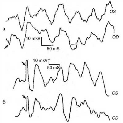 В нашей клинике темновая адаптация была применена у 39 больных (Г. А. Коваленко). Отмечены увеличение индекса и амплитуды альфа-ритма, нарастание его упорядоченности, распространение на передние отделы головного мозга, появление или усиление билатерально-синхронных заостренных парохоизмальных колебаний тета- и дельта-диапазона.