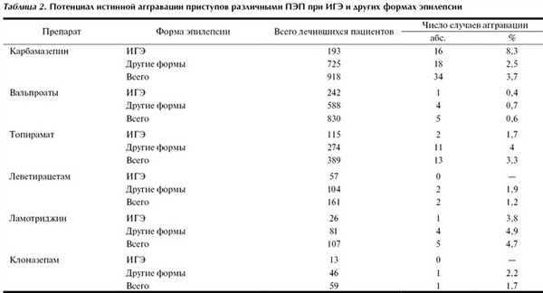 Таким образом, у всех приведенных в табл. 2 ПЭП потенциал аггравации был относительно невысок, наиболее часто учащение приступов ассоциировалось с применением карбамазепина у пациентов с ИГЭ (8,3%), а также ламотриджина, топирамата и карбамазепина у лиц с другими формами эпилепсии (в первую очередь - КФЭ и СФЭ) - 4,9, 4 и 3,7% соответственно.