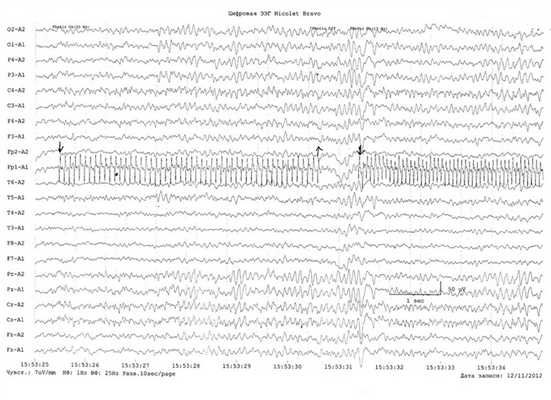 Рис. 2. Фрагмент ЭЭГ больного эпилепсией 26 лет. Регистрируется стойкий эпилептогенный очаг в затылочно-височном отведении правого полушария.
