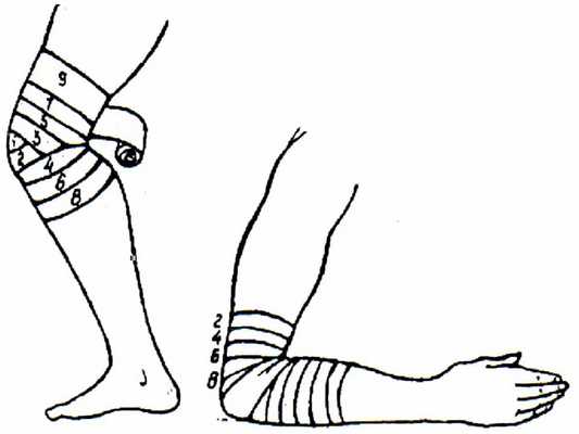 - Следует ослаблять натяжение бинта по мере движения от узкой части к широкой.