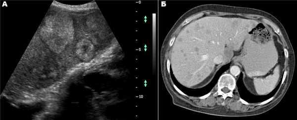 Пациентка Н., 60 лет, 20.05.2013 обратилась в Медико-санитарную часть ГУП «Водоканал Санкт-Петербурга» с жалобами на рези в животе, тяжесть в правом подреберье. При пальпации живота выявлена увеличенная в размерах за счет правой доли, болезненная, плотная печень, выступавшая из-под реберной дуги на 4–5 см.