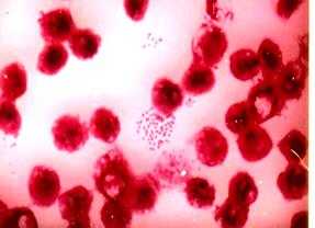 1. Микроскопический метод. Изучение морфологии менингококка в мазках из ликвора больного с подозрением на менингококковую инфекцию (демонстрация). Типично наличие грамотрицательных диплококков, располагающихся внутри лейкоцитов.
