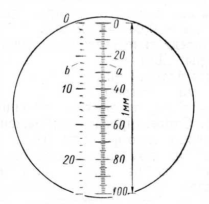 Окулярный микрометр (окуляр-микрометр) представляет собой обычный окуляр, в который вставлена (между линзами) круглая тонкая стеклянная пластинка со шкалой (длиной 5 мм) с делениями через 0,1мм.