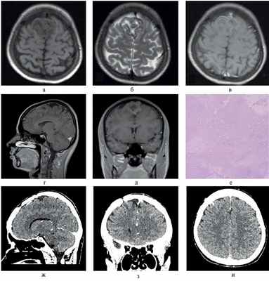 Предоперационные магнитно-резонансные томограммы в T1 (а); T2 (б); T1 с контрастным усилением (в—д). Гистологическая картина микропрепарата (е), окраска гематоксилином и эозином, увеличение ×100. Компьютерные томограммы с контрастным усилением через 6 мес после операции (ж—и).