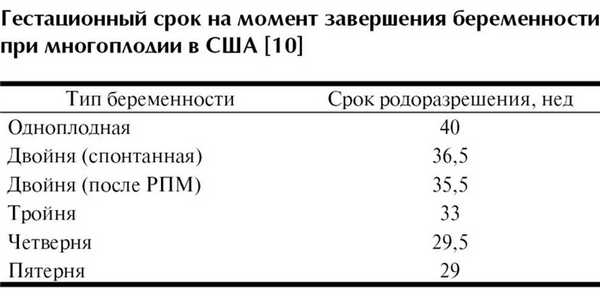 3 нед, менее 3 см — еженедельно, менее 2,5 см — каждые 4—7 дней. Если длина шейки матки составляет 2—2,5 см и нет клинических проявлений истмико-цервикальной недостаточности, может быть рекомендовано наложение циркулярного шва на шейку матки. В сроке 18—26 нед при длине шейки менее 2 см циркулярный шов на шейку матки показан во всех случаях. По мнению J. Elliott и соавт. [23], в 12,5% случаев многоплодия с тремя плодами и более возникает необходимость накладывать шов на шейку матки. Однако как профилактическую меру эту процедуру проводить не рекомендуется. Применяя такую активную тактику ведения и мониторинга преждевременных родов, авторы добились завершения беременности тройней в 35,0 нед, четверней и пятерней — в 34,0 нед. Этот показатель значительно выше общенационального в США (см.таблицу).